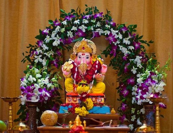 Ganesh, the elephant headed god, is the god of Knowledge and prosperity. Ganesh Chaturthi is celebrated on 4th day of “Bhadrapad” or “Bhadra” Hindu month that is end of August and the beginning of September. It is a 10 day festival, celebrated all over India with different traditions, all 10 days of worshipping the idol of Lord Ganesh. The preparations for Ganesh Chaturthi starts much before monsoon by the sculptors. The idol is traditionally sculpted using clay or soil and is painted with natural colors. The preparations at home begin a month prior to the festival. Houses are cleaned, decorated and made ready for the arrival of their beloved God. The idol is brought inside the house on the 1st day, and a puja is performed, when everyone wears traditional clothes. After the puja is over, the idol is placed at its place in a beautifully decorated wooden stool and background (as in picture).
