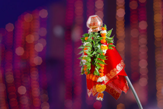 Gudhi (as shown in image) stands tall at the entrance of all the Marathi households. Gudhi contains a tall wooden stick whose top end is covered first with a traditional saree, Gathi (a chain of sugar candy), Neem leaves, garland and at the end, a kalash or urn ( A vessel used in rituals, especially a sacred water vessel) and Padwa means the 1st day. The scientific event of intersection of equator with meridians happens at the beginning of Chaitra month. Alongside, its not just a random tradition of hoisting Gudhi but, it has a meaning behind it.